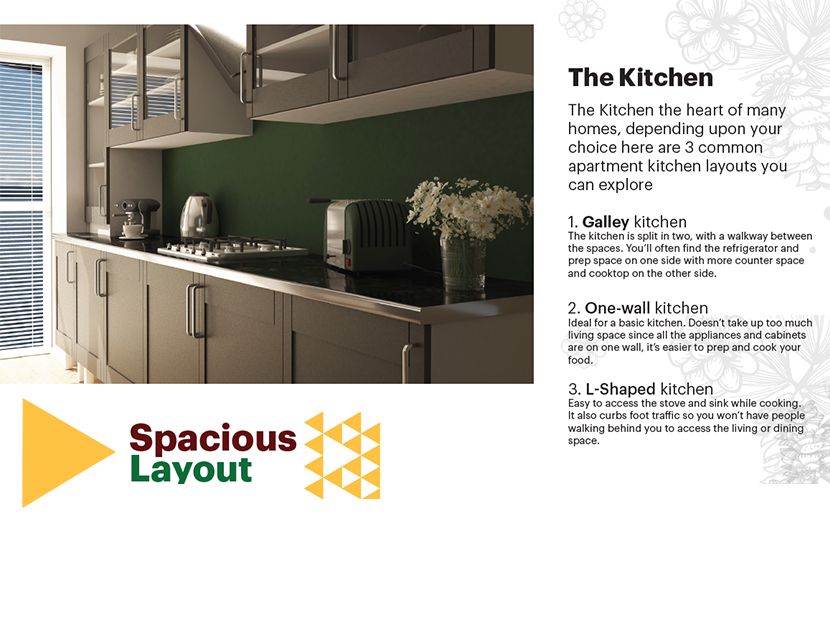 The kitchen, the heart of many houses are available with 3 layouts, galley kitchen, one wall kitchen or L shaped.